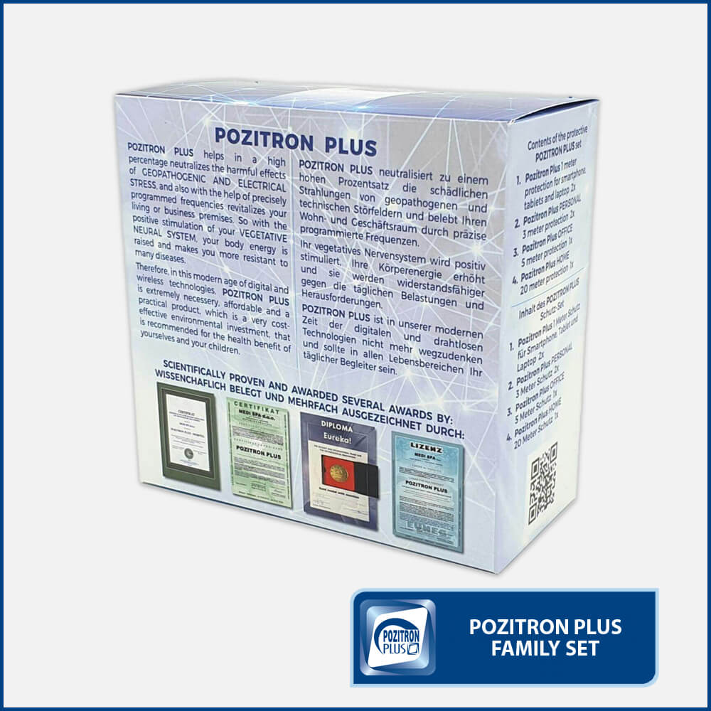 POZITRON PLUS – FAMILY SET consists of 9 NANO-TECH products: 1 x POZITRON PLUS – LIVING SPACE (20 meter radius of protection, size 9×9 cm), 4 x POZITRON PLUS – PERSONAL (3 meter radius of protection, size 5×5 cm) and 4 x POZITRON PLUS – MOBILE PHONE (1 meter radius of protection, size 3×3 cm).